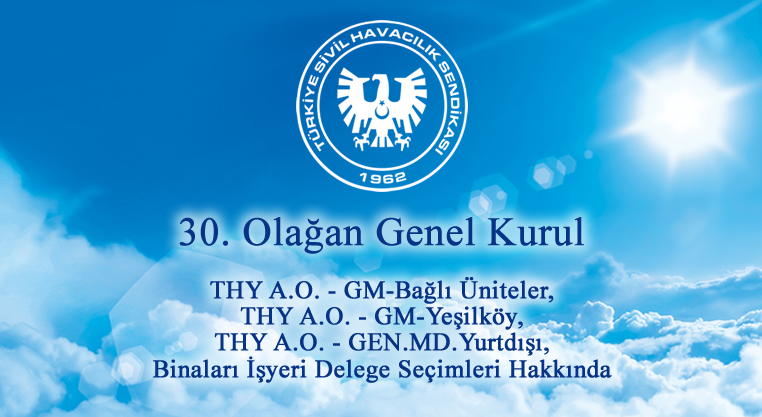 Türkiye Sivil Havacılık Sendikası 30. Olağan Genel Kurulu için belirlenecek delegelerin tespiti amacı ile 18.08.2025 saat 09:00 - 17:00 arasında gerçekleştirilecek olan THY A.O. – GM-Bağlı Ünitlr binası, THY A.O. – GM-Yeşilköy binası ve THY A.O. – GEN.MD. Yurtdışı binası işyeri delege seçim duyuruları ilgili işyerlerinde çalışan üyelerimize mail yoluyla gönderilmiştir.