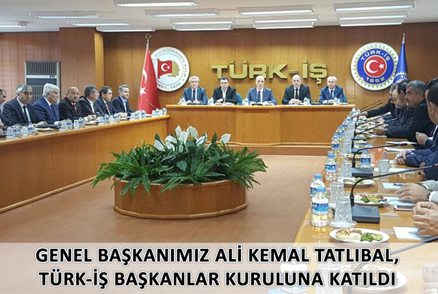 13 Ekim 2015 Salı günü, Konfederasyonumuz Türk-iş'in Genel Merkezi'nde, Genel Başkanımız Ali Kemal Tatlıbal'ın ve Türk-iş'e bağlı diğer sendika başkanlarının katılımıyla düzenlenen Başkanlar Kurulu toplantısında gündemde yer alan konular ve Ankara'da yaşanan terör olayı görüşüldü. Son aylarda artan ve hepimizi derinden sarsan terör olaylarının yanı sıra, 2015 yılının ilk dokuz ayında iş kazaları ve Meslek hastalığı sonucunda 1317 işçimizin hayatını kaybettiğine dikkat çeken Başkanlar Kurulu, Aralık ayında gerçekleştirilecek olan Türk-iş 22. Olağan Genel Kurulu hazırlıklarını değerlendirdi. Türk-iş Ana Tüzüğünün tarihi ile ekonomik sosyal ve hukuk alanında çalışmalarına yön veren 24 temel ilkenin güncellenmesi ile ilgili komisyon kurulması kararlaştırıldı.