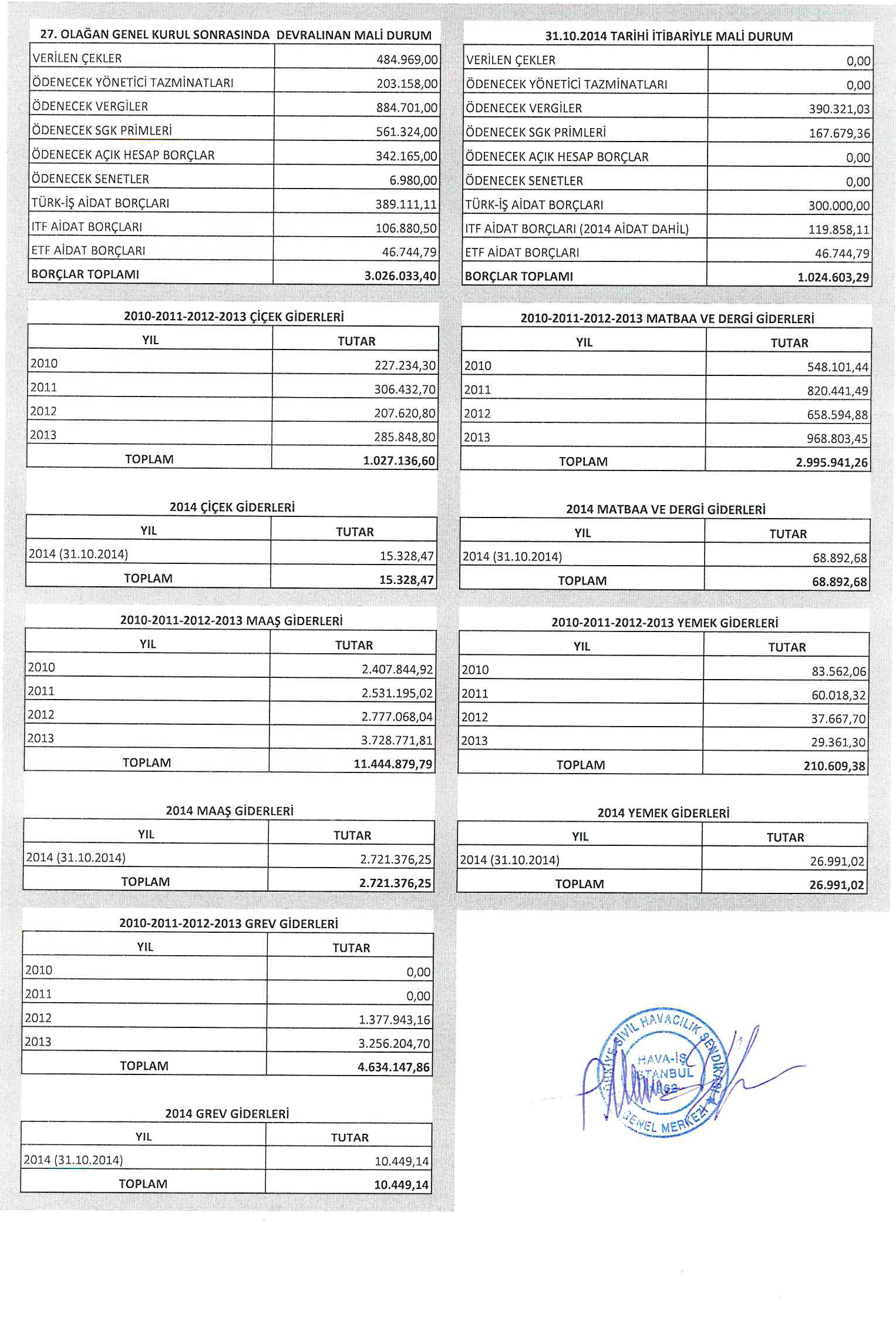 27.Olağan Genel Kurul sonrasında devraldığımız borçlar toplamı 3.026.033,40 TL iken 31.10.2014 tarihi itibariyle borçlarımızın toplamı 1.024.603,29 TL'ye düşmüştür. Ekte sizlerle paylaştığımız özet mali durum tablomuzda da göreceğiniz üzere giderlerimizde de gözle görülen büyük farkta düşüş gerçekleştirilmiştir.